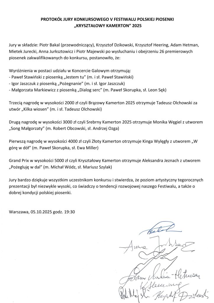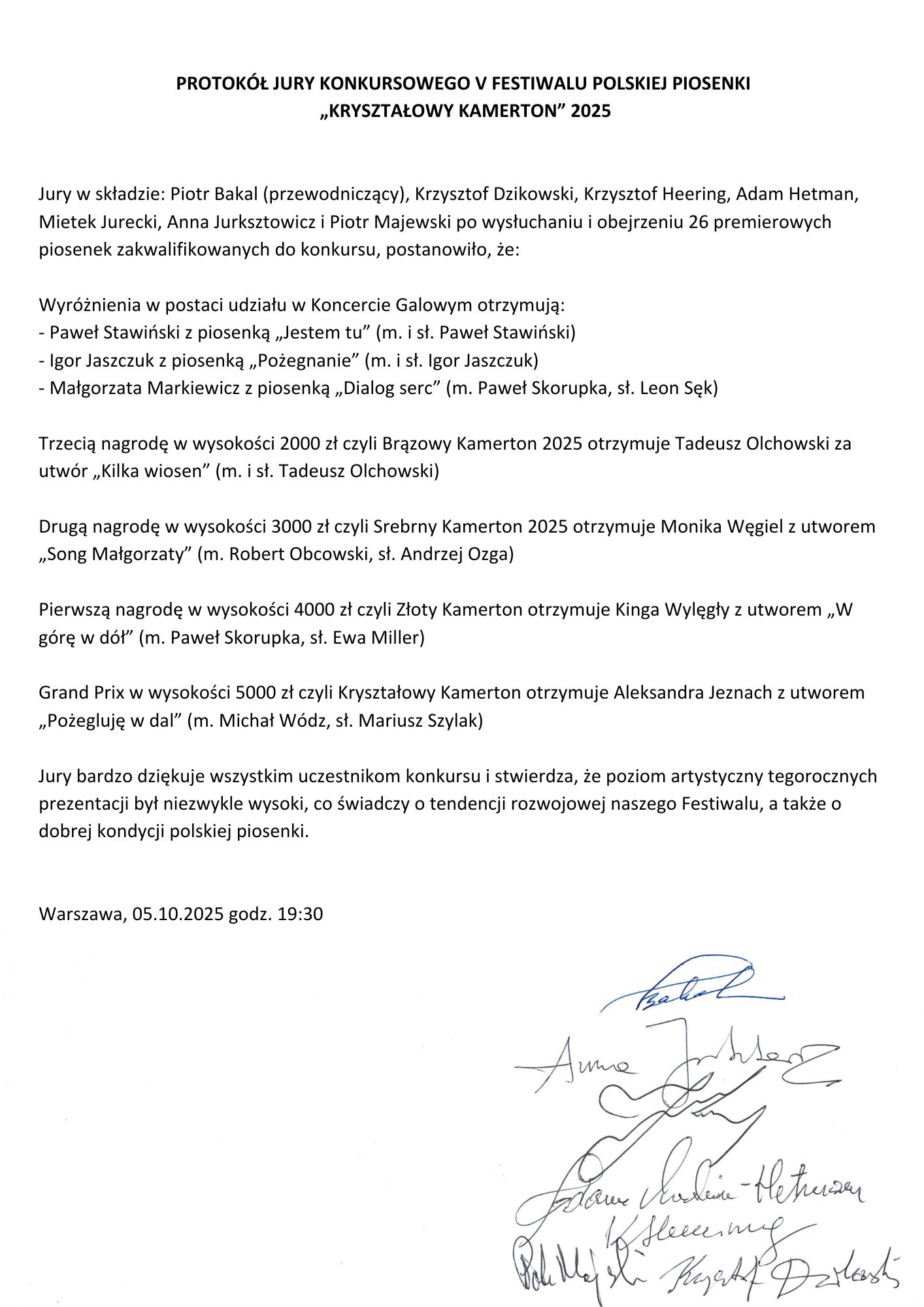 PROTOKÓŁ JURY KONKURSOWEGO V FESTIWALU POLSKIEJ PIOSENKI „KRYSZTAŁOWY KAMERTON” 2025