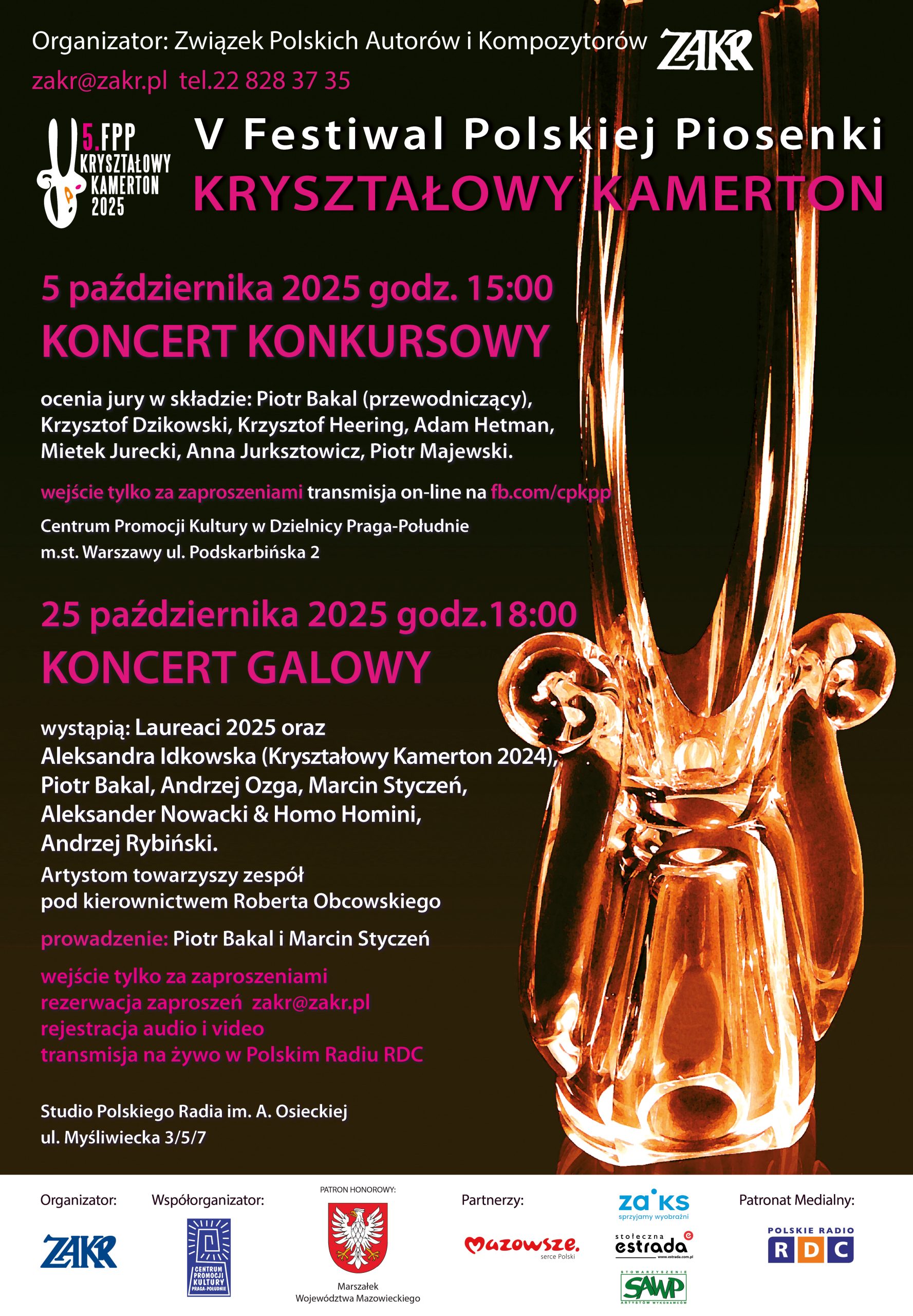 Serdecznie zapraszamy na Koncert Galowy V Festiwalu Polskiej Piosenki „Kryształowy Kamerton”, który odbędzie się w najbliższą sobotę 25.10.2025 o godz. 18 w Studiu Polskiego Radia im. Agnieszki Osieckiej przy ul. Myśliwieckiej 3/5/7 w Warszawie.